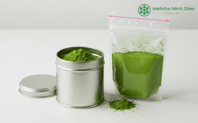 Để bảo quản matcha đúng cách, điều đầu tiên là sử dụng một hộp kín khí, tránh cho không khí tiếp xúc trực tiếp với bột trà. Nếu mua matcha trong gói zip, bạn nên ép thật chặt phần miệng zip sau mỗi lần sử dụng, sau đó cho vào hộp thiếc hoặc hộp nhôm có nắp chắc chắn. Cách làm này giúp hạn chế tối đa việc oxy xâm nhập.